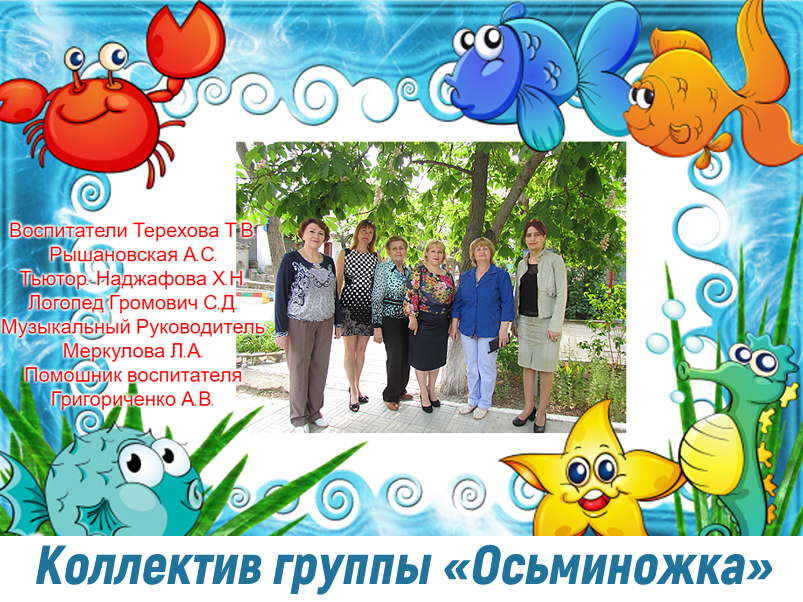 Общие сведения | Название группы: «Осьминожка» ФИО воспитателей: Терехова Татьяна Васильевна, Рышановская Анна Сергеевна. Помощник воспитателя: Григориченко А.В. Тьютор: Наджафова Хиджран Фарадж кызы. ФИО специалистов, работающих в группе: учитель-логопед – Громович Светлана Демьяновна, педагог-психолог – Мерясева Александра Валерьевна, инструктор по ФК – Цып Даниил Станиславович. Адрес: г. Судак, улица Гагарина, дом 7. Возраст детей: 6 лет |